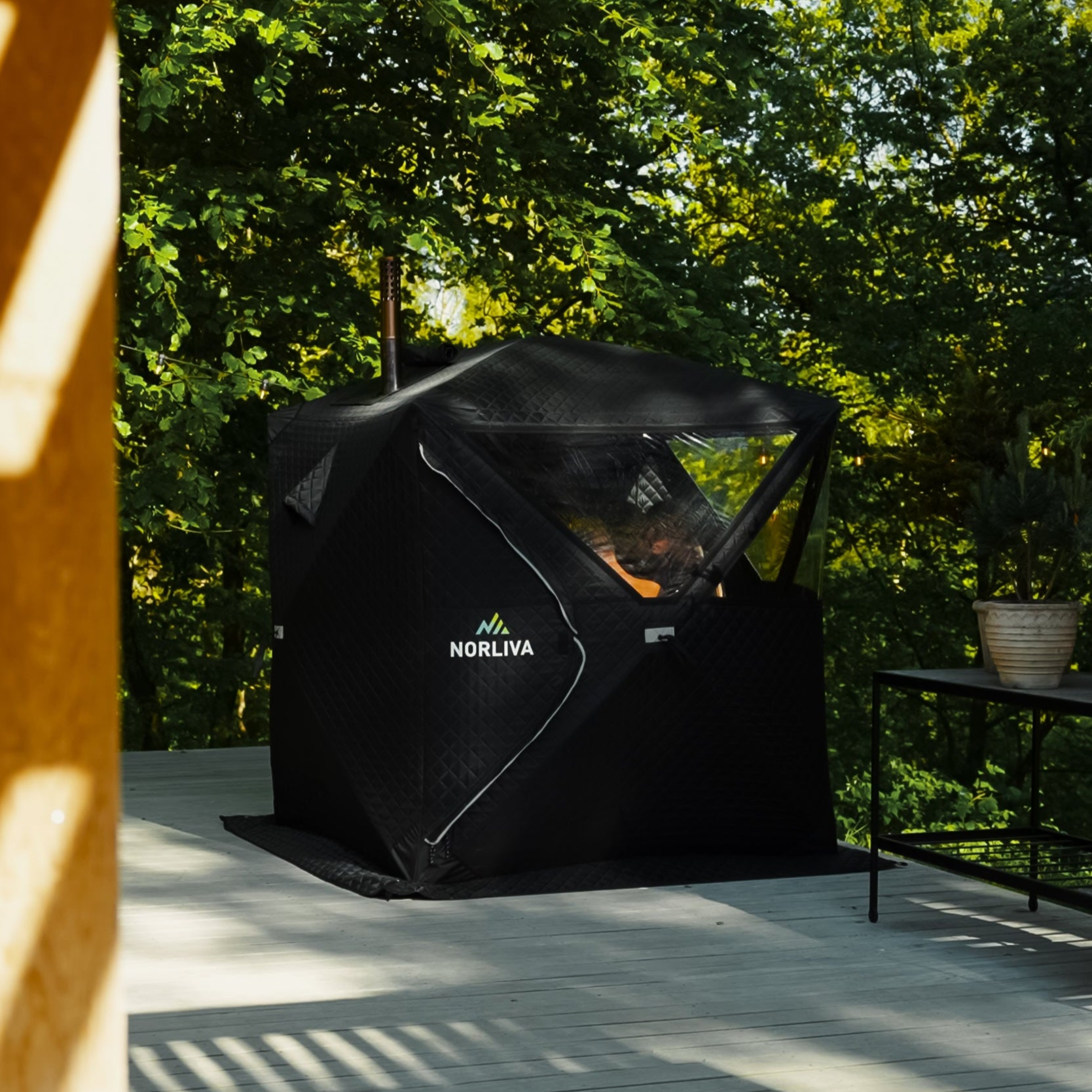 Erlebe wohltuende Wärme und entspannte Momente im NORLIVA Saunazelt. Die gleichmäßige Hitze sorgt für Erholung und ein authentisches Saunaerlebnis – jederzeit und an nahezu jedem Ort