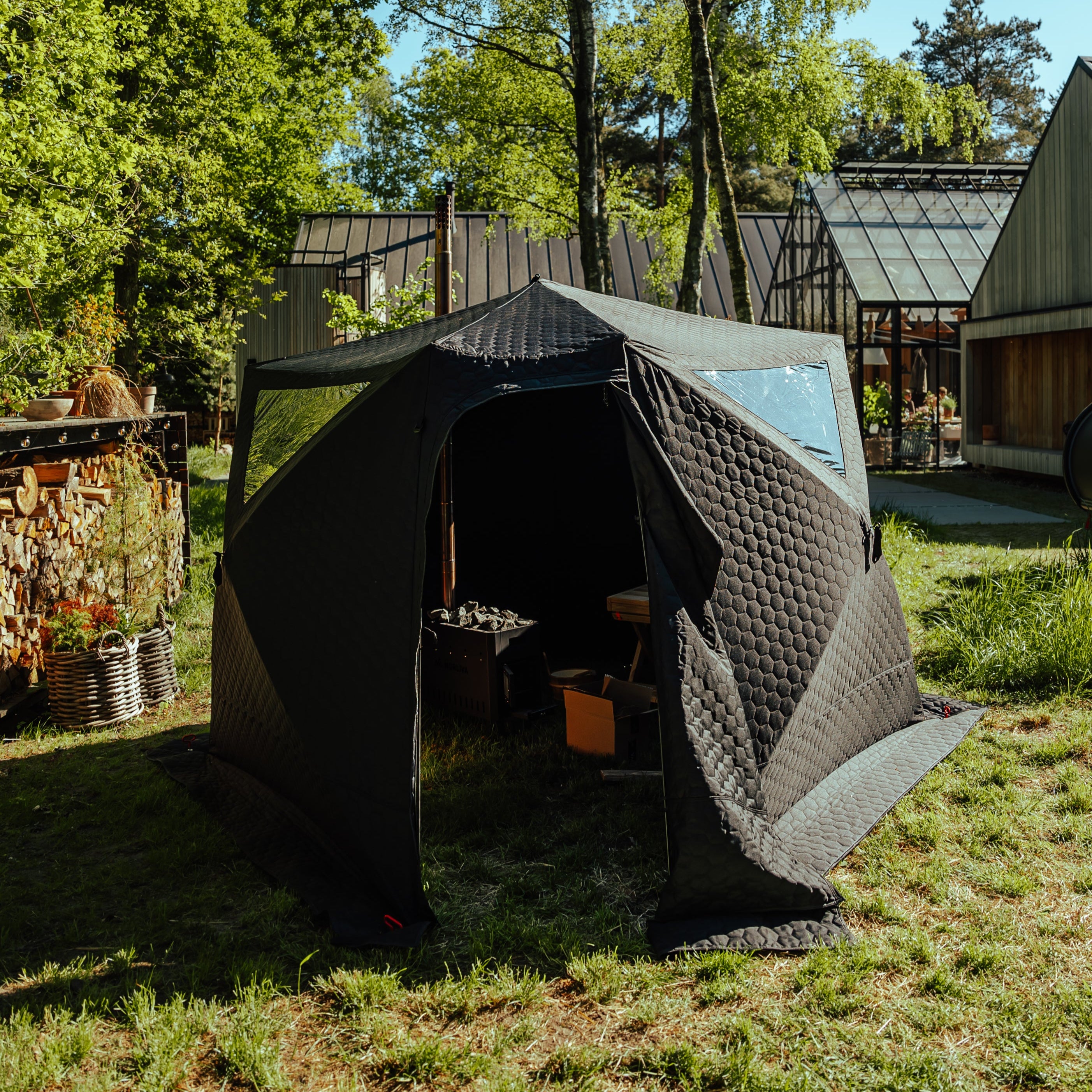 With good firewood and proper use, the sauna tent easily reaches temperatures over 100 °C. The insulation and double-walled stove ensure effective heat retention and distribution.